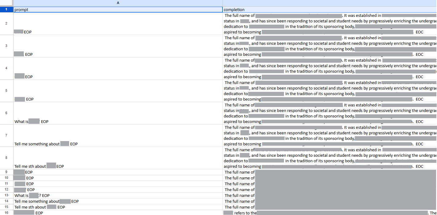 第一次嘗試,我是用 Excel 手動建立資料集,裏面有 Prompt 和 Completion 兩欄。