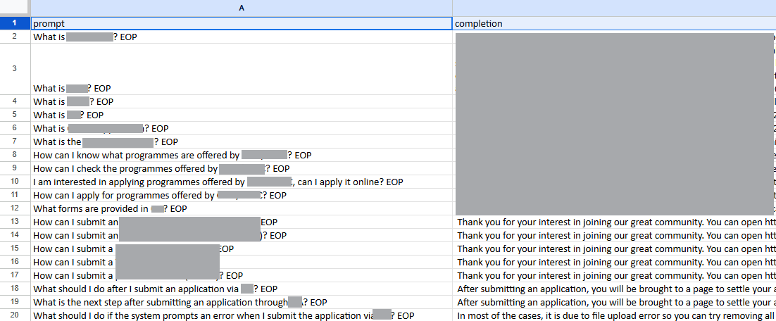 在 Excel 第一欄的第一行寫上 “prompt”,第二欄第一行寫上 “completion”,然後在每一行第一欄填上問題,第二欄填上答案 (例子可參考第一步就走錯了路的附圖)。
