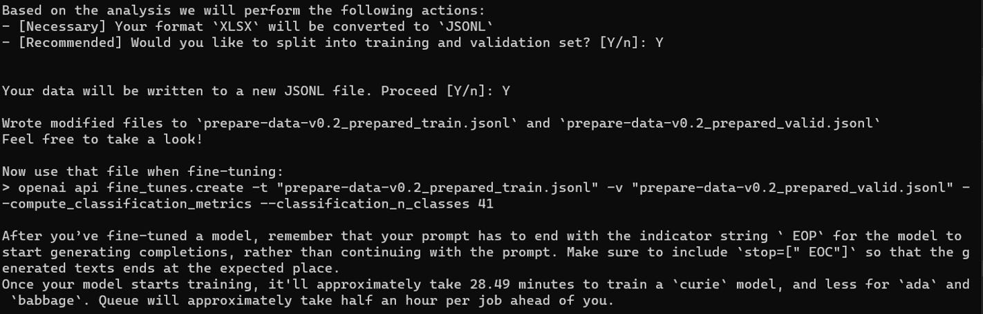 openai tools fine_tunes.prepare_data -f <path to file>完成後會生成兩份 .jsonl 檔案,亦提供了下一步的指示